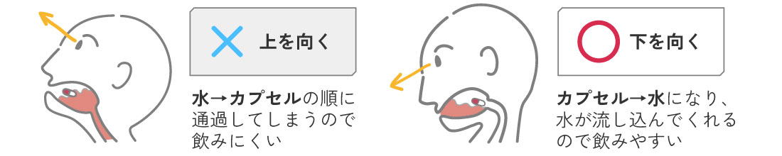 カプセル剤は水に浮きますので錠剤を飲む時のように上を向いて飲むとカプセルだけ口に残ってしまいやすいです。下を向いて飲めば簡単にカプセルも服用できるようになります。